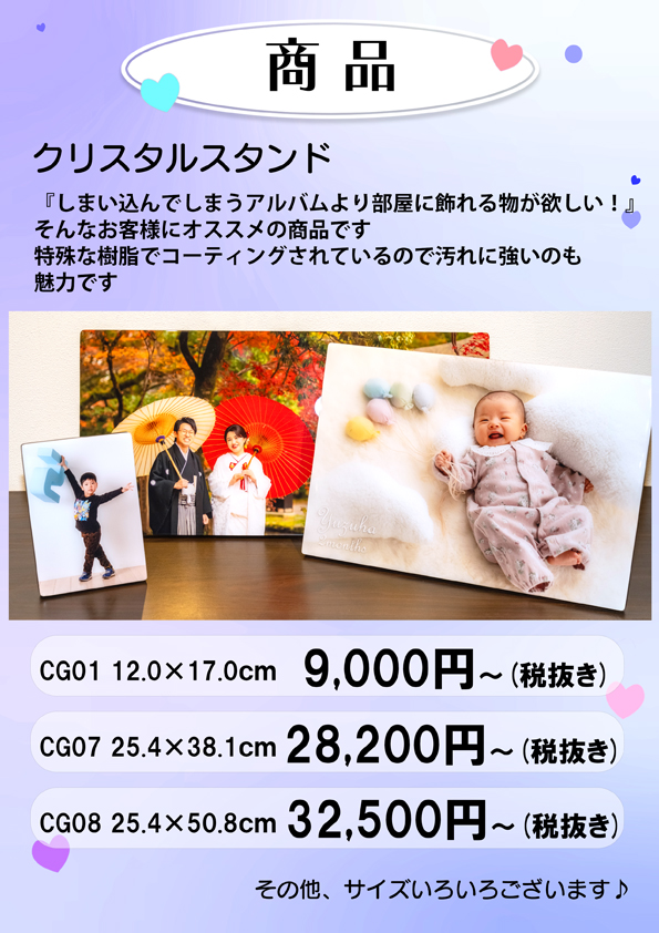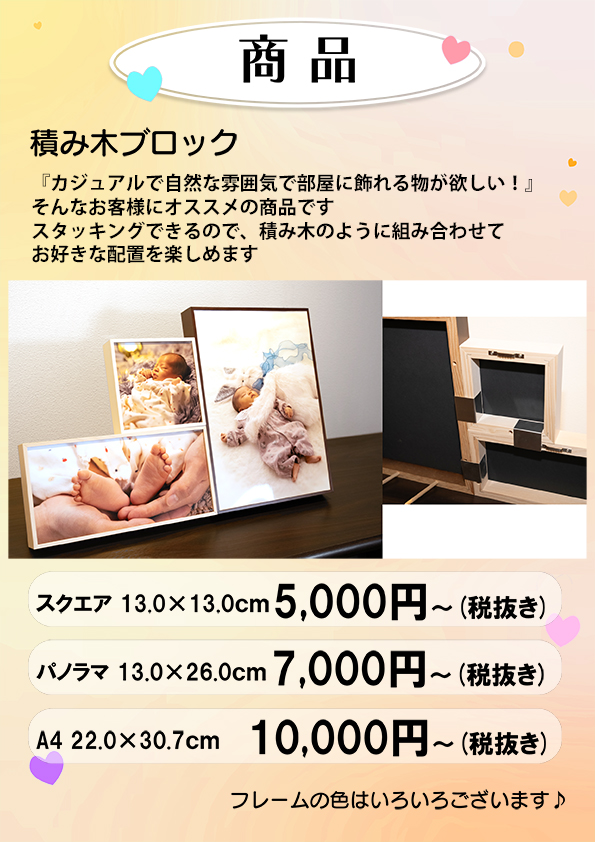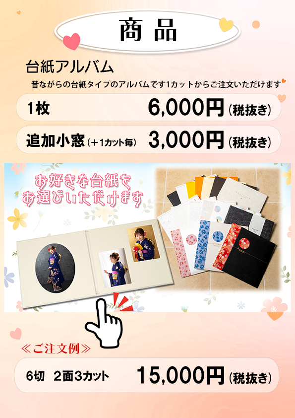 お客様のご要望のサイズ・枚数・デザインに合わせて製作いたしますのでお気軽にご相談ください。(1枚だけの撮影も可能です。)